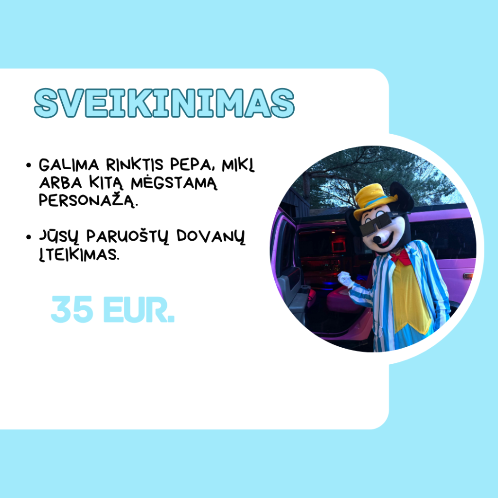 Siūlome platų personažų pasirinkimą skirtingoms progoms. Susipažinkite su mūsų siūlomais personažais tinkančiais vaikų šventėms.
