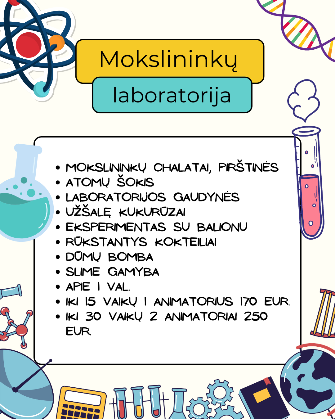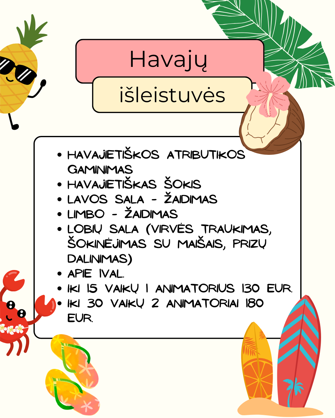 Mūsų siūlomos, įtraukiančios programos tinka įvairioms progoms ir šventėms. Susipažinkite su mūsų programų asortimentu ir išsirinkite tinkamiausią jūsų šventei. Jei tokios neradote, maloniai laukiame jūsų žinutės.